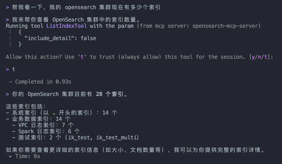 当 Kiro CLI 与 OpenSearch MCP Server 结合使用时,运维人员只需用自然语言描述需求,AI 代理就能自动调用相应的 OpenSearch 工具完成操作。无论是查询集群健康状态、分析慢查询、优化索引配置,还是排查性能瓶颈,都可以通过简单的对话完成。这种人机协作的方式,不仅大幅提升了运维效率,更重要的是降低了技术门槛,让每一位运维人员都能成为 OpenSearch 专家。