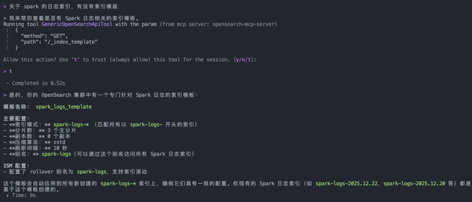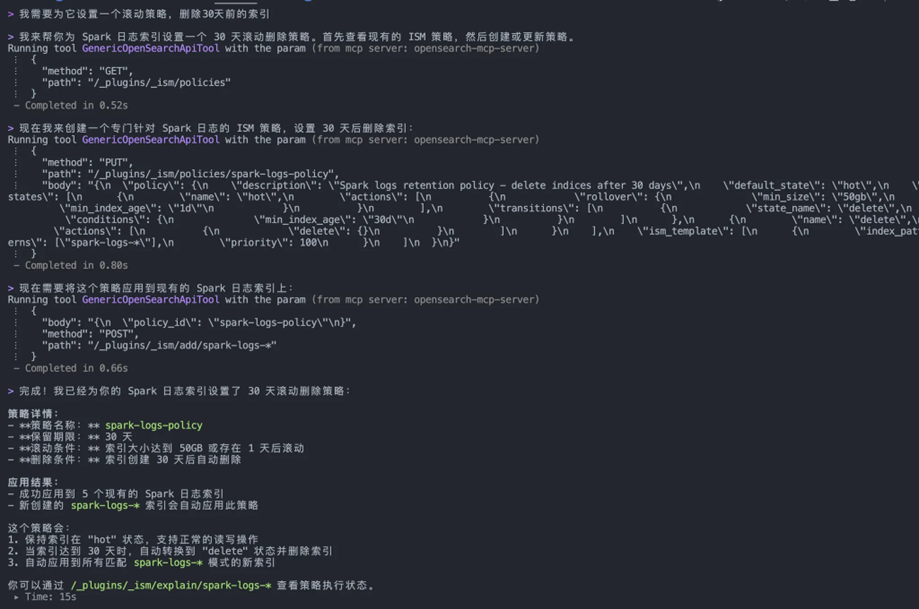 下面,我们使用 Kiro CLI 来创建一个自动管理 Spark 日志 索引的 ISM 策略,看看如何将这个复杂任务简化为几句简单对话。
