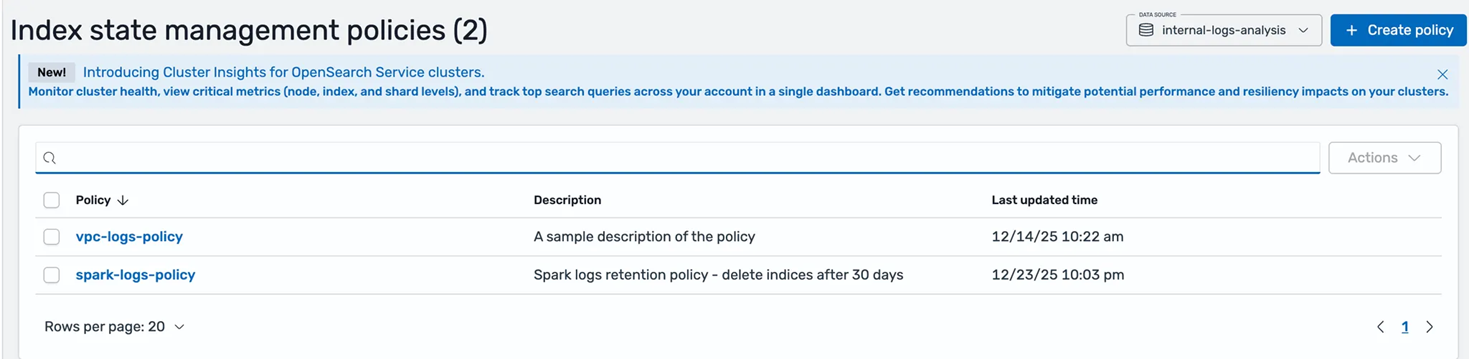 5. 回到 OpenSearch Dashboard UI,进入到 ISM 中,可以看到一个名为 spark-logs-policy策略已经创建成功