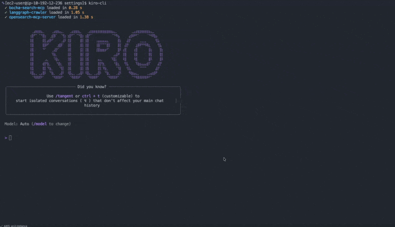 现在,通过结合 Kiro CLI 的 AI Agent 能力和 OpenSearch MCP Server,我们可以彻底改变这一现状。下面通过实际案例展示如何使用 Kiro CLI 来优化向量搜索配置和性能。