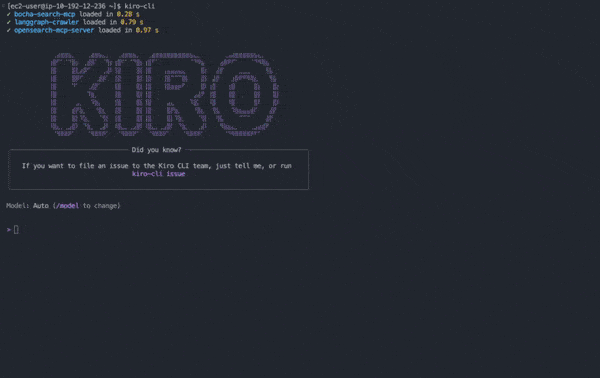 这些场景不仅覆盖了 OpenSearch 运维的核心工作,更展示了如何借助 AI 的能力加速搜索分析应用的开发和优化。让我们看看 Kiro CLI + OpenSearch MCP Server 如何让每个人都能成为 OpenSearch 专家。