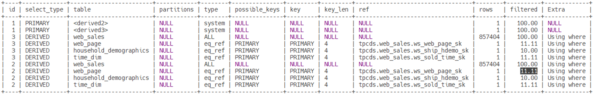 | id | select_type | table | partitions | type | possible_keys | key | key_len | ref | rows | filtered | Extra |