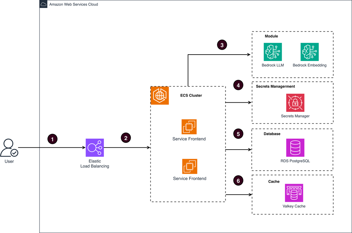 - 架构引入了Amazon ElastiCache for Valkey 缓存层(兼容Redis 8.0),用于存储频繁访问的数据,减少数据库负载并提高应用响应速度。