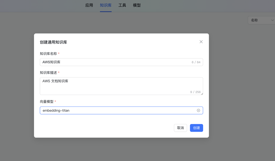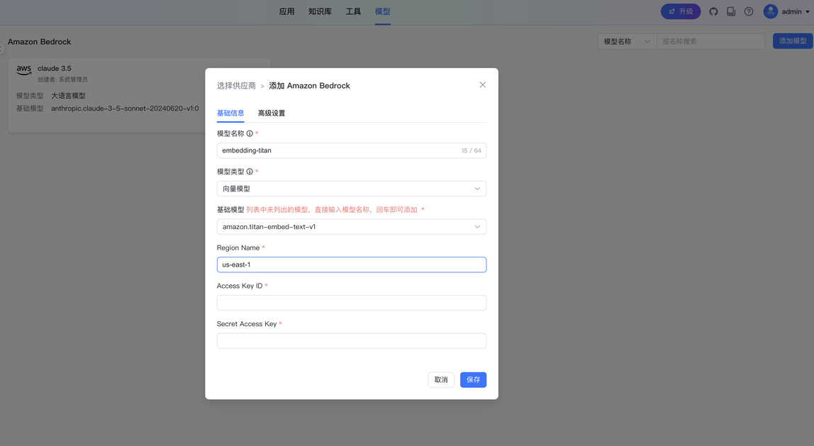 首先需要添加LLM模型和Embedding模型,MaxKB 支持Bedrock模型,可以在模型配置页面进行添加,具体的操作如下: