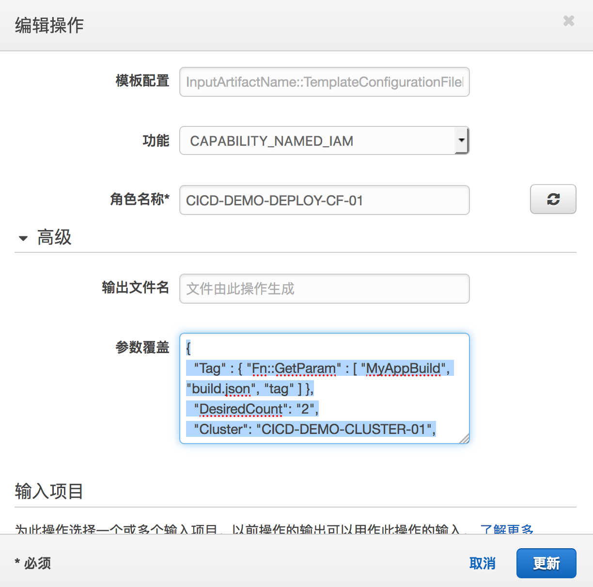 输入项目这里输入Build阶段和S3模版源的输出。