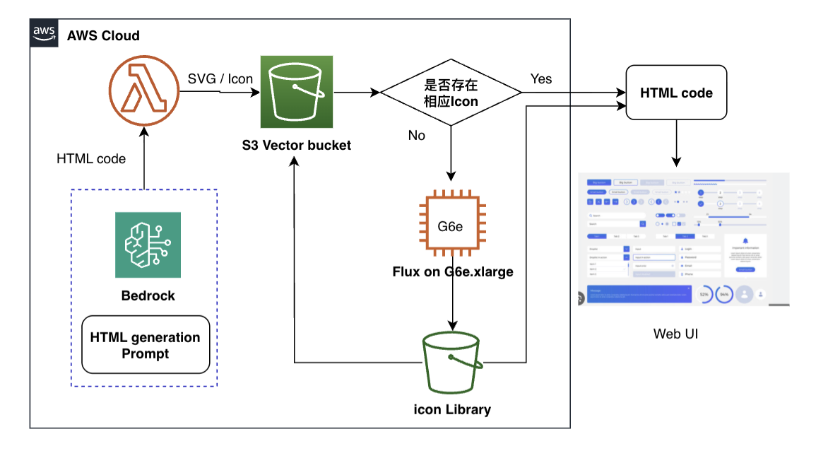 本文将介绍如何基于Flux on G6e 和S3 Vector 构建一个具有高性价比的icon图片生成与检索方案,返回s3 url 用于满足智能UI设计中HTML或H5界面的Icon需求。相比于直接调用Flux API,该方案在ToC生产环境中具有成本优势,成本分析与临界值估算在本文的最后部分展开。