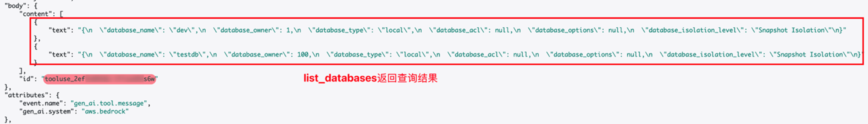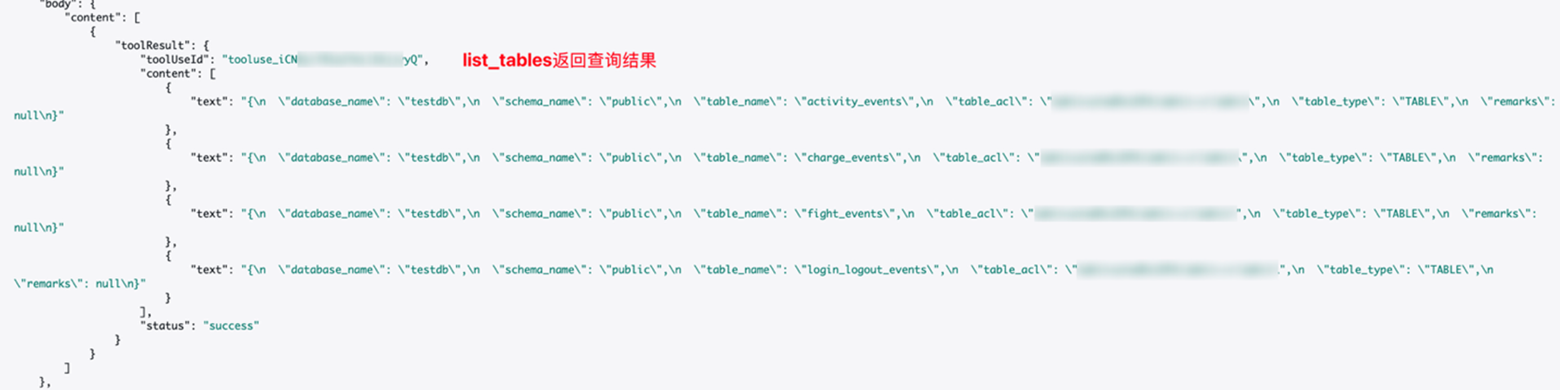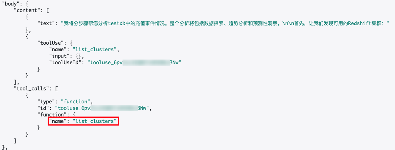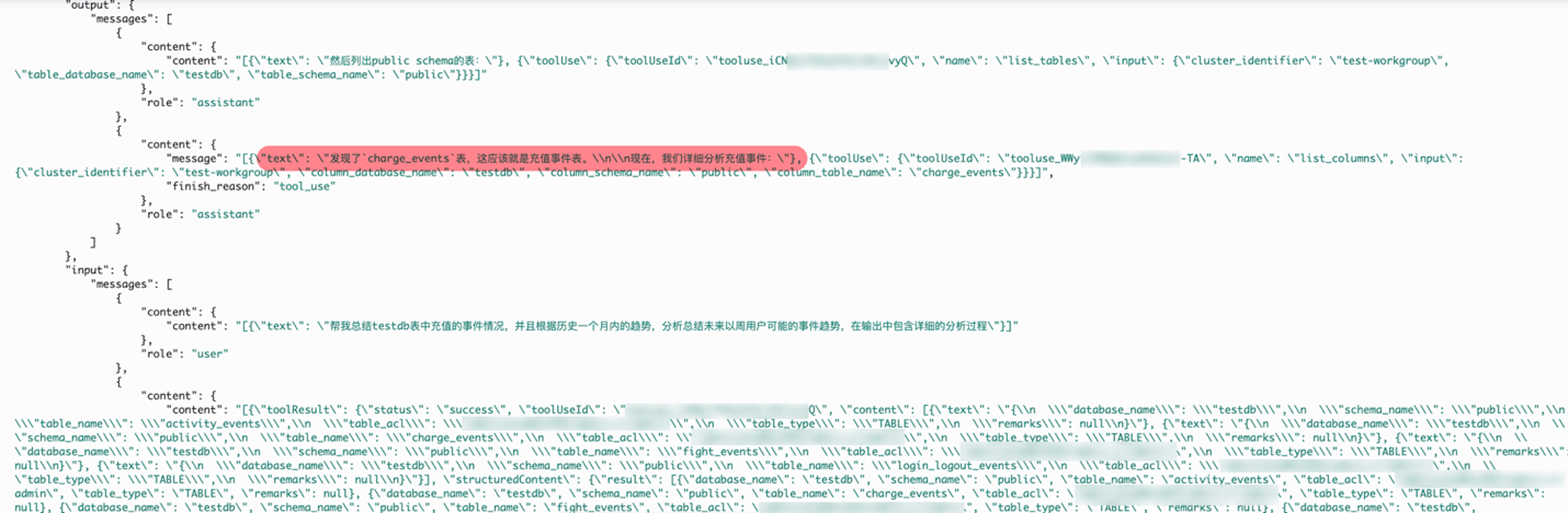 上述测试方式中显式声明了具体需要查询数据库的名称,这是因为数据库名称为testdb,定义不明确,建议在生产环境中使用与业务紧密相关的数据库/表名称,或通过注释声明,或在系统提示词中添加定义以减少工具调用次数并且提高准确率。同时,我们在提示词中没有声明具体需要查询的表,因为表名称定义清晰,在下面的日志内容分析中可以更加清楚的看到Redshift MCP Server的工具调用过程中,AI可以明确的找到所需要的charge_events表。