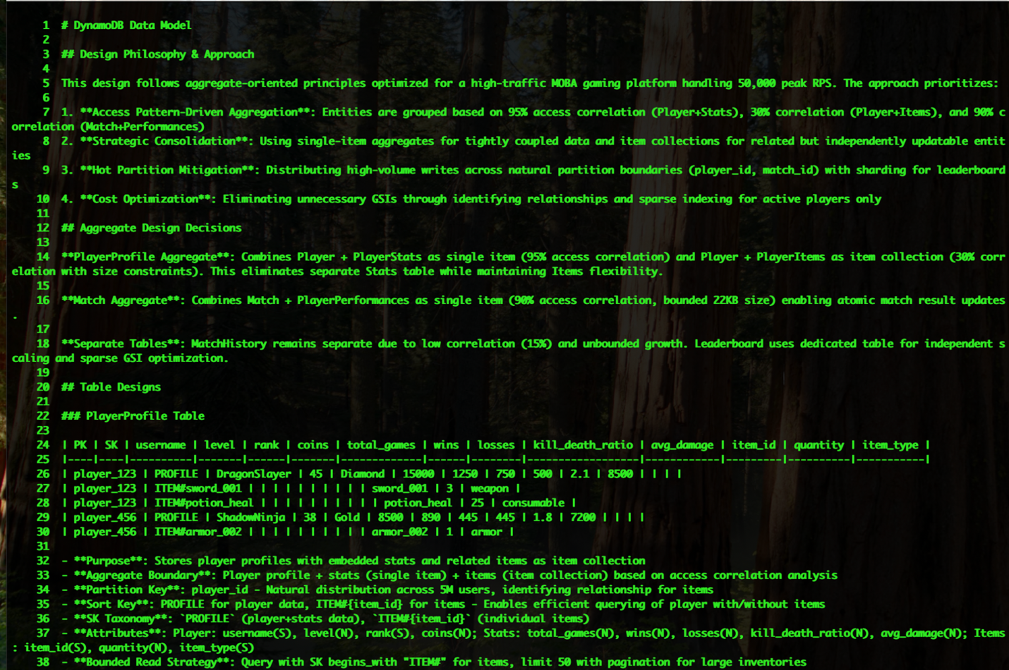 这个设计在保证高性能的同时实现了成本优化,完全满足高流量游戏平台的需求。每个部分都遵循了DynamoDB MCP工具提供的标准模板结构,提供了完整的数据建模文档,涵盖了从设计理念到具体实现的所有关键方面。