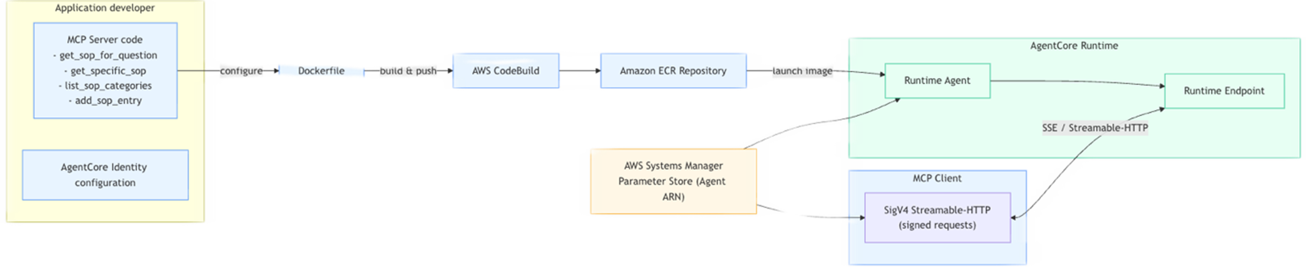 - MCP 客户端负责通过 SigV4 与运行时建立可靠的流式 HTTP 通道;