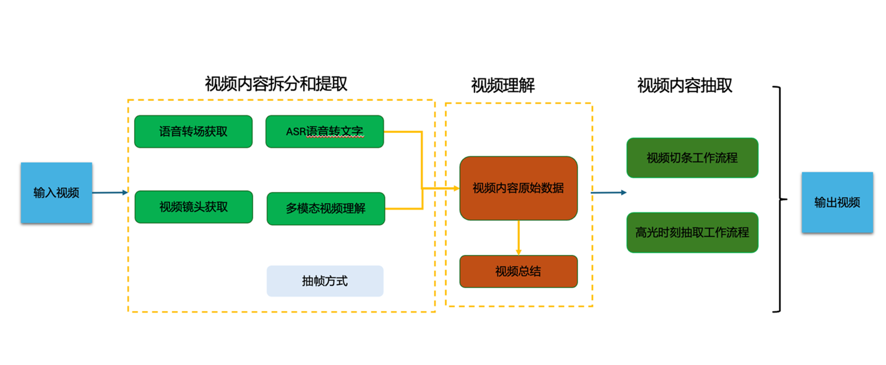 随着多模态模型的不断发展,对于视频理解的能力不断增强,通过多模态模型与多种专业模型的配合,能够多维度的高效率的理解视频内容,包括视频中音轨,视频中字幕,视频中的画面,视频中分片;这也使得通过深入的视频理解,有明确目标的视频二次加工成为可能。