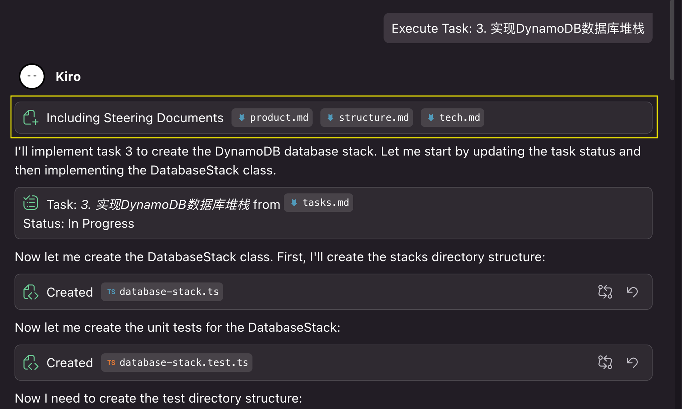在进入任务执行前,我让Kiro 结合Specs三个文档(requirements.md, design.md, tasks.md),更新了Steering。