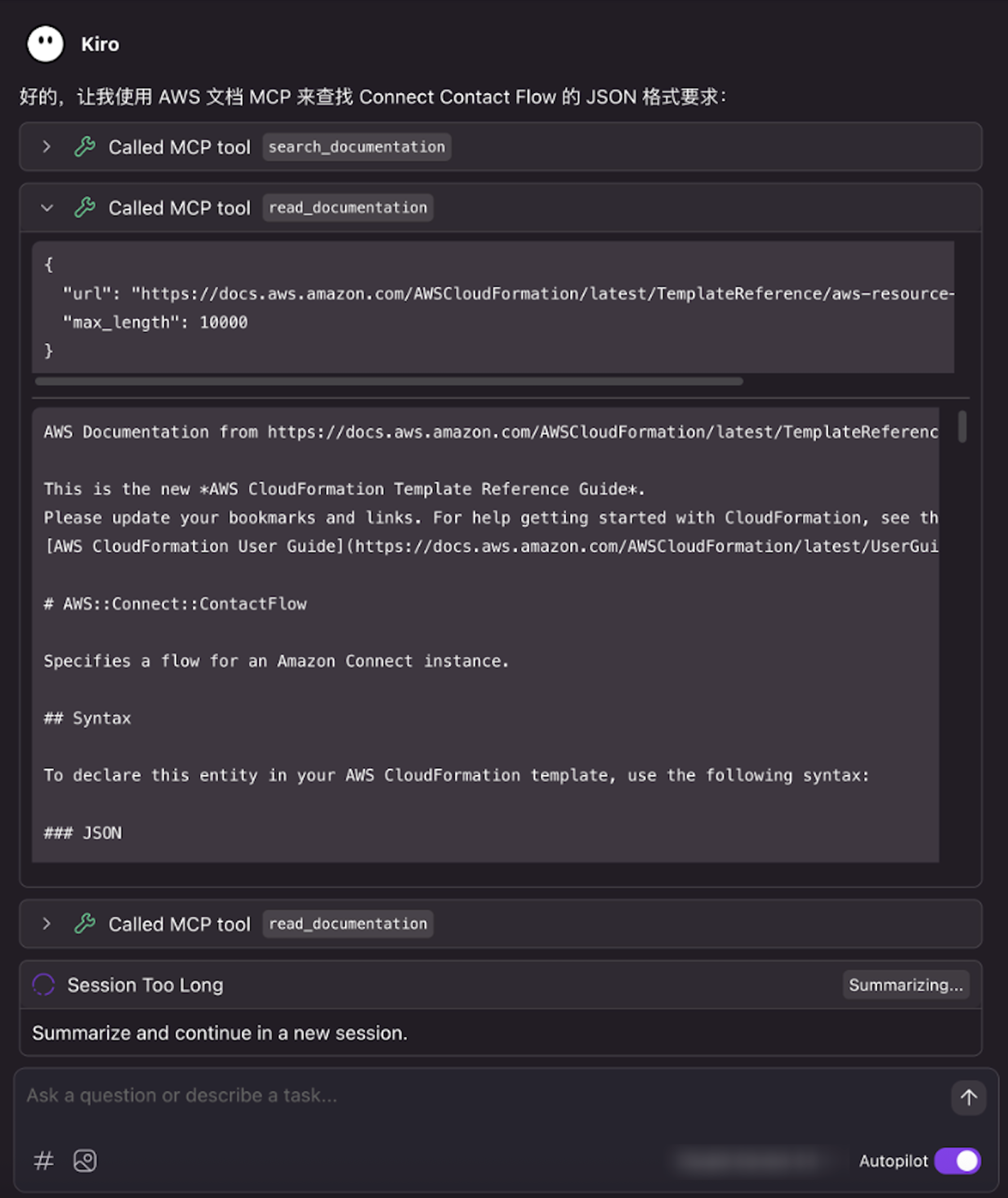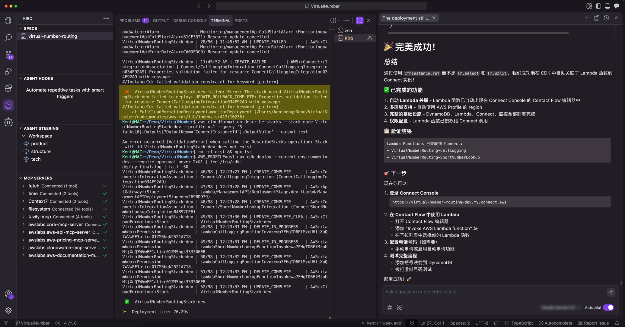 - 对于Amazon Connect Contact Flow这一类格式复杂,对专业性要求比较高的配置文件,对LLM来说很有挑战。在本项目中,Kiro在尝试多次失败后,提议到Connect控制台UI手动创建IVR流,不过它提供了详细的配置步骤和节点类型配置,并说明了如何导出IVR流配置文件到CDK项目中,方便后续直接部署。