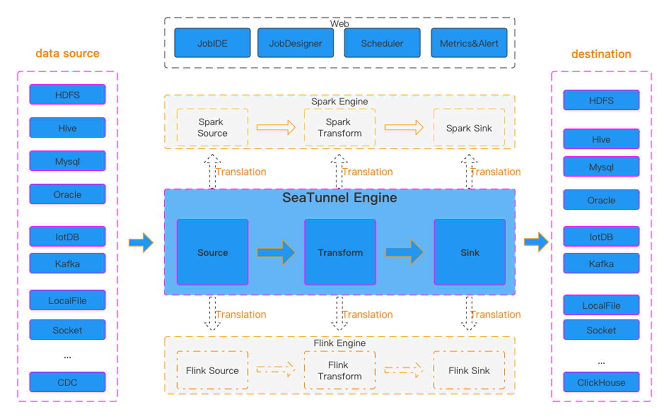 - 多引擎支持:SeaTunnel默认使用SeaTunnel引擎(Zeta)进行数据同步。 SeaTunnel还支持使用Flink或Spark作为Connector的执行引擎,以适应企业现有的技术组件。 SeaTunnel 支持 Spark 和 Flink 的多个版本。