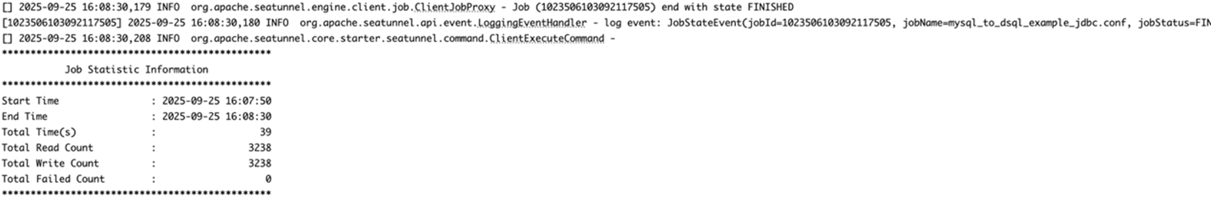 将上面的配置保存为mysql-to-dsql.conf 文件(请注意需要将示例中的值替换为真实的参数),存放在apache-seatunnel-${version} 的config 目录下,执行以下命令: