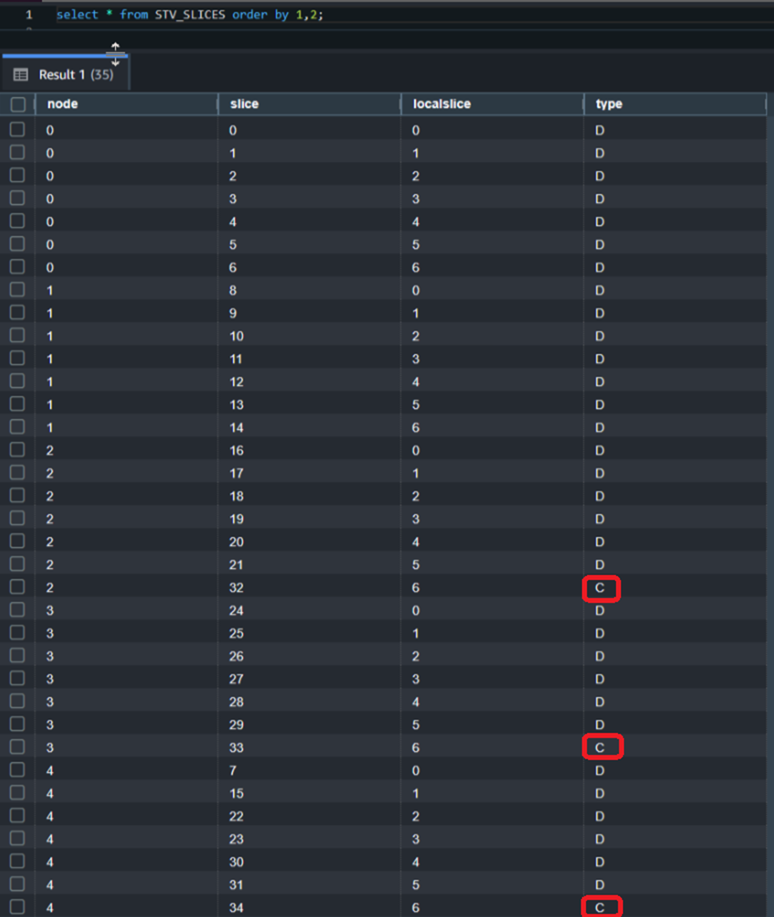 通过查询STV_SLICES系统表可以看到当前的集群一共有5个节点,每个节点上有7个切片。但是在节点3、4、5上各有一个Compute类型的切片。可以看到Data类型的切片在每个节点的数量是不同的。