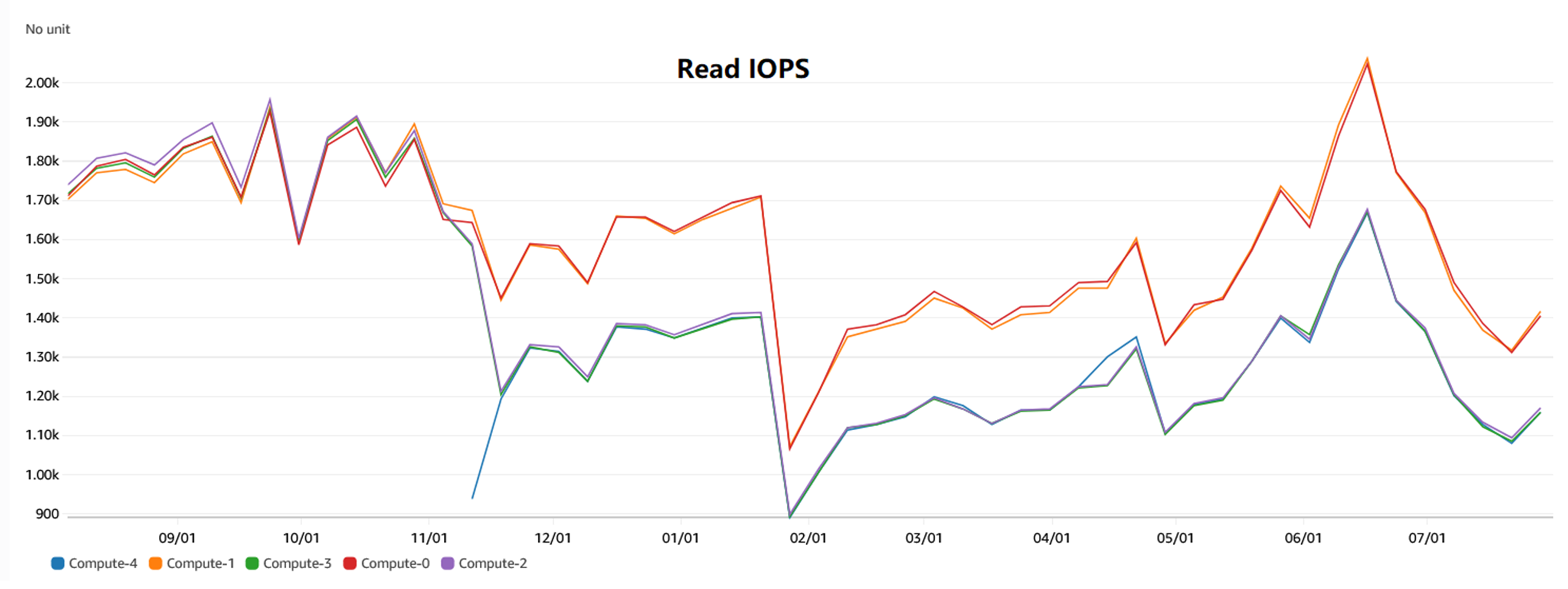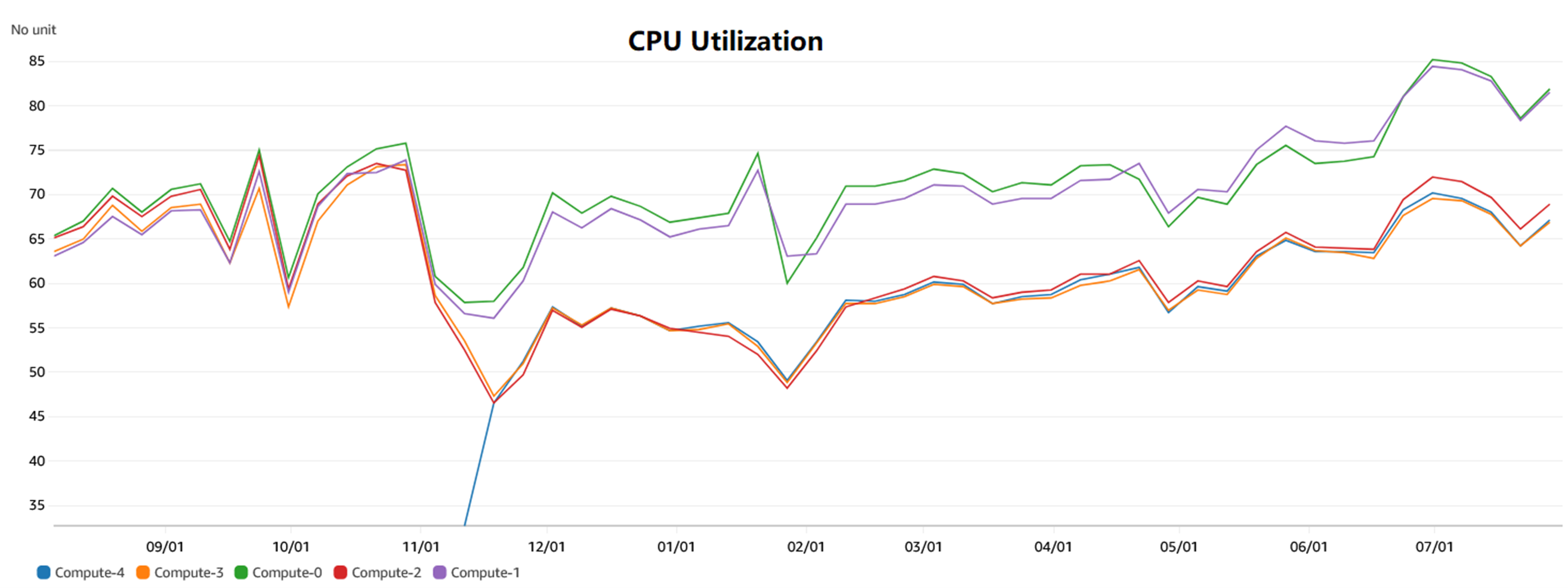 从CloudWatch CPU Utilization% 可以看到由于切片在节点上的分布不均匀而导致的资源使用不均匀。