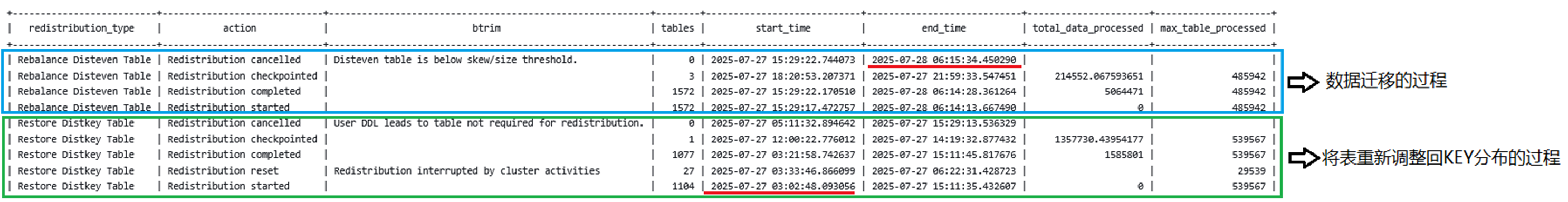 以上的脚本运行结果如下图,可以清晰地看到Restore Distkey Table和Rebalance Disteven Table的开始、结束时间。