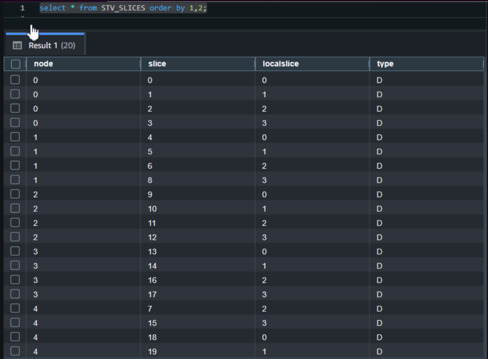 通过查询STV_SLICES系统表可以看到当前的集群的5个节点上各有4个切片,切片总数量已经由原来的32个调整到了20个,并且所有的切片类型都是D(Data)。
