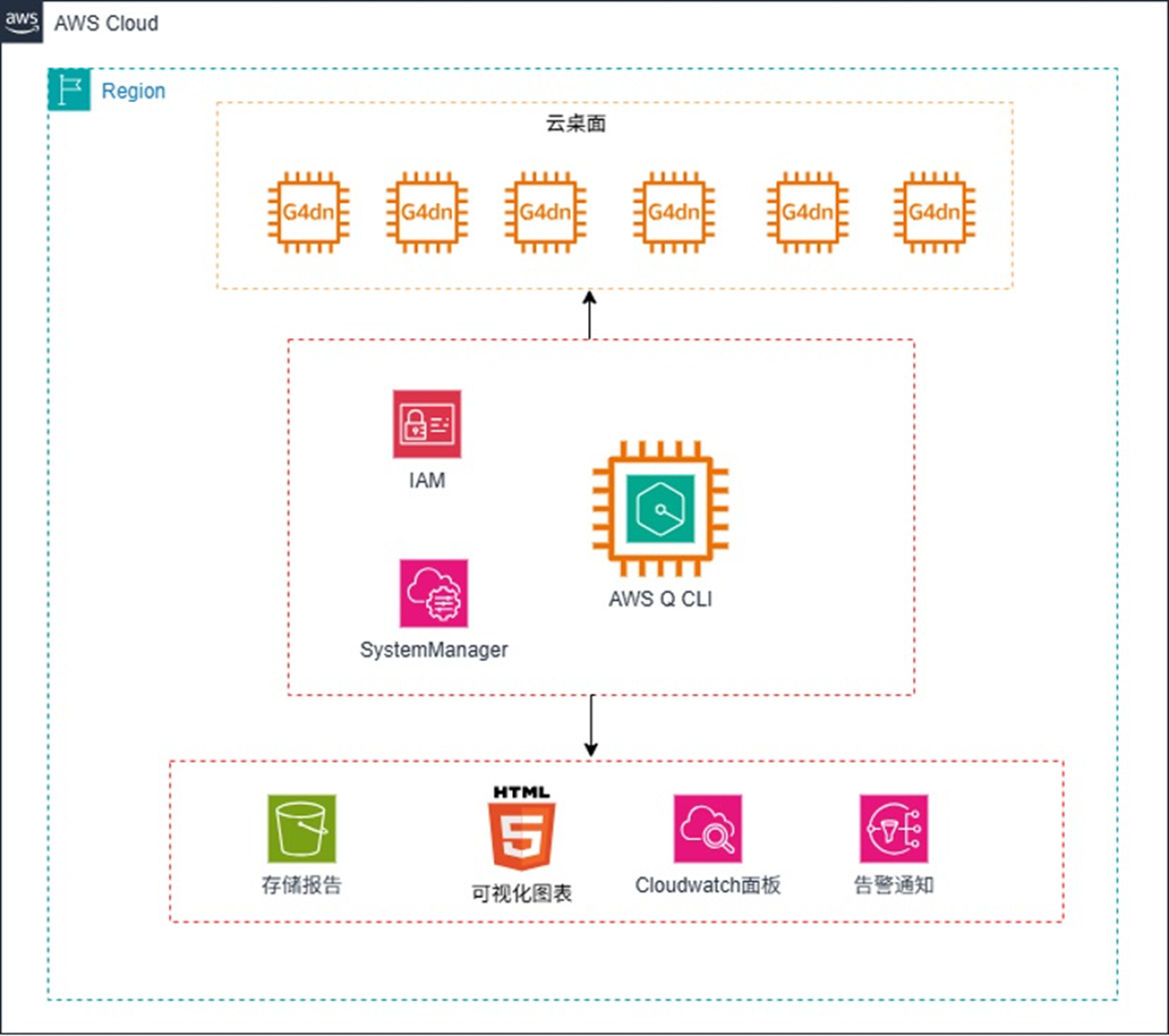 使用 AWS Systems Manager + Amazon Q CLI 的方式,引入 Amazon Q 强大的人工智能能力,核心是通过自然语言交互 + AI 智能分析+分析报告总结 的闭环体系,实现云桌面的智能运维。