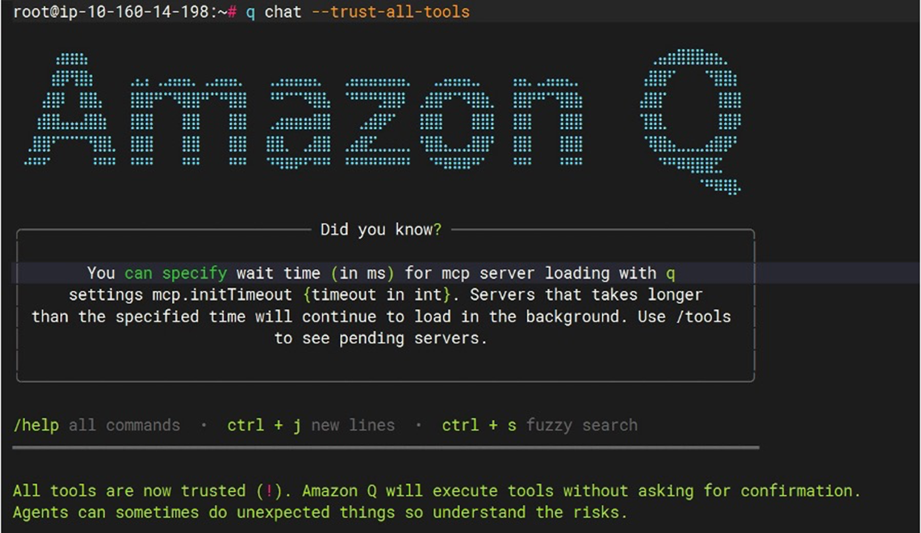 – 登录 Amazon Q CLI(q login → q chat –trust-all-tools)