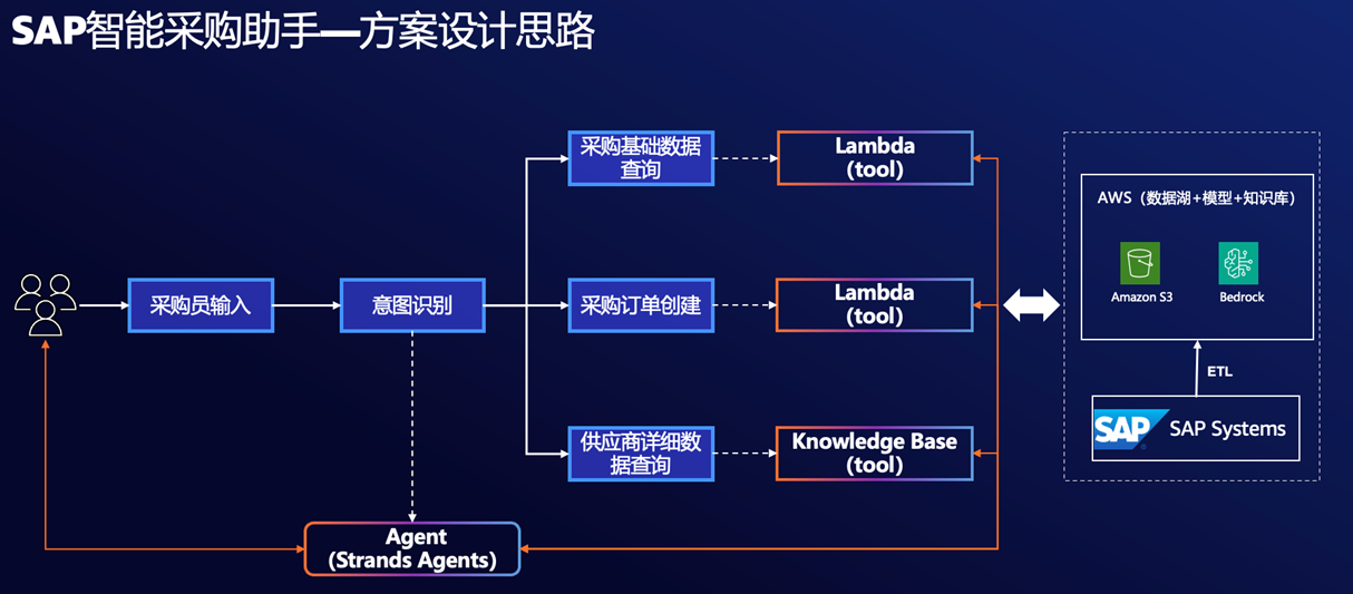 SAP智能采购助手,在获取采购人员的自然语言以后,要通过Agent识别采购人员的意图;通过Tools实现采购相关RFQ查询、报价数据查询,供应详细数据查询,以及采购订单的创建;在数据集成和管理层面,过AWS的服务Glue实现SAP数据的ETL,通过AWS的Lambda调用SAP Gateway的API以实现创建采购订单,具体设计思路详见图1。