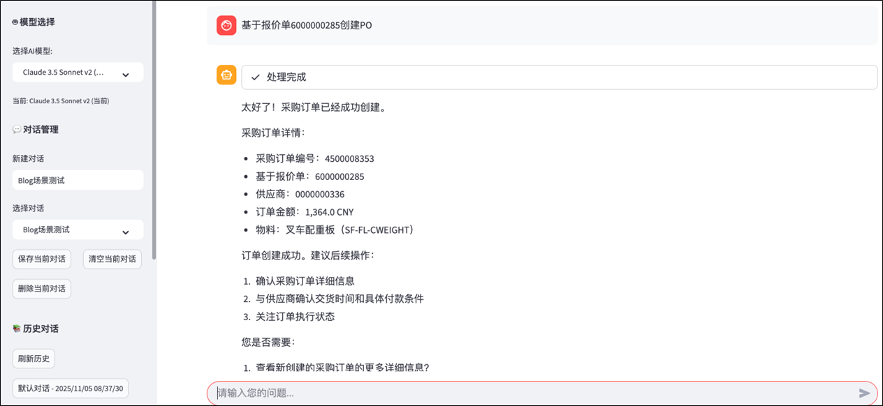 - 效率提升:采购人员无需操作SAP系统,通过自然语言快速完成查询与PO创建,流程耗时从小时级缩短至分钟级;