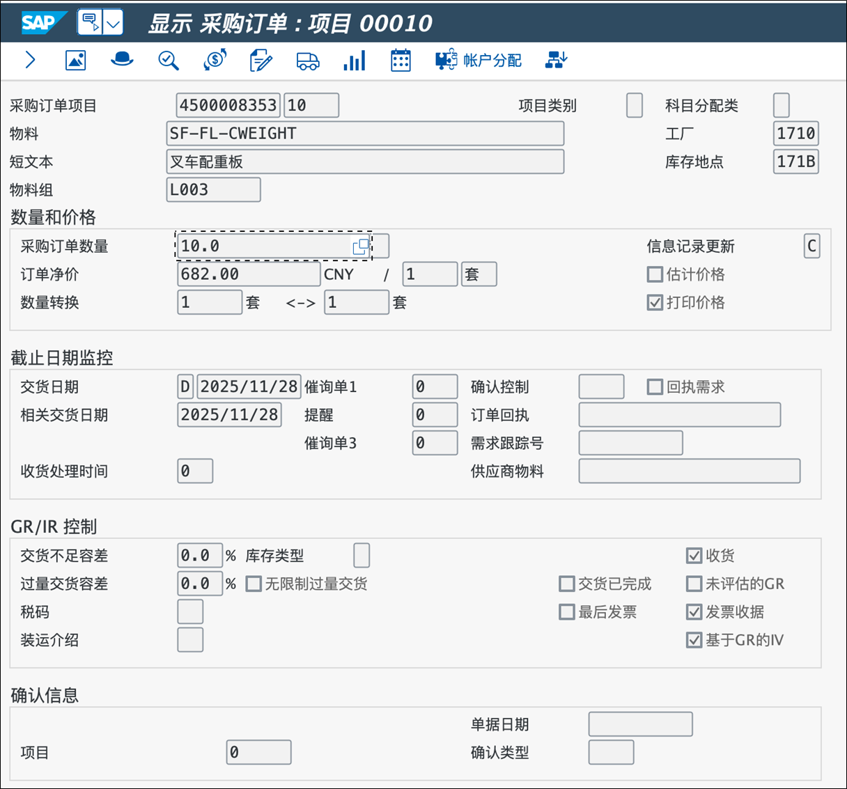 在SAP GUI中输入T-code(ME23),输入4500008353,查看采购订单详细,具体信息如SAP GUI截图所示,物料、数量、供应商和价格都正确。