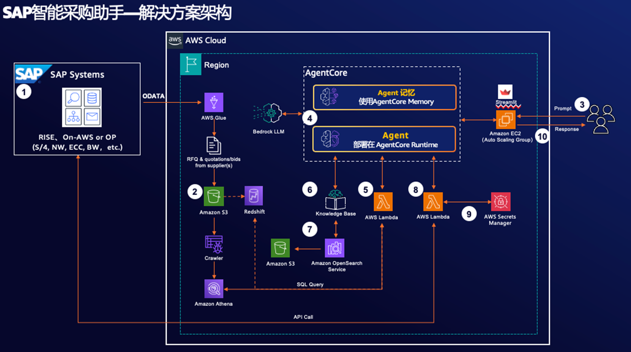 在企业采购管理中,采购人员要在SAP中进行RFQ查询、供应商信息核对、PO创建等流程操作,存在信息分散、查询效率低、流程衔接不畅等痛点。传统方式下,采购人员需在SAP系统、Excel报表、邮件等多渠道切换,不仅耗时耗力,还容易因信息不对称导致决策延迟或采购风险。本文将介绍如何通过Bedrock AgentCore Runtime, Strands Agents SDK以及Glue,实现与SAP进行数据集成,开发部署Agent,构建SAP智能采购助手的方案。