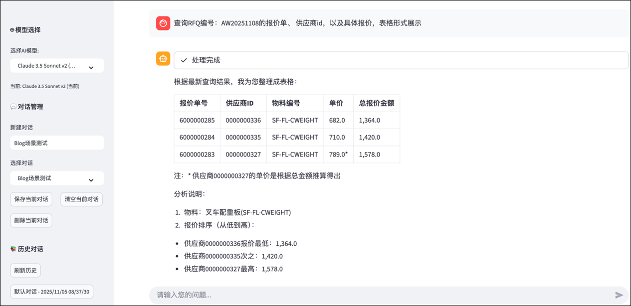 - 用户输入:查询RFQ编号:AW20251108的报价单、 供应商id,以及具体报价,表格形式展示
