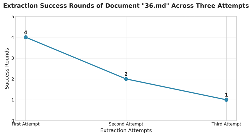 首先,我们清除所有AgentCore Memory,随机取出一份小合同36.md,运行3次,分别考查每一次需要经过几轮抽取可以获得满足需要的输出。发现第一次需要4轮,第2次由于使用了前面的经验用了2轮,第3次1次提取成功。