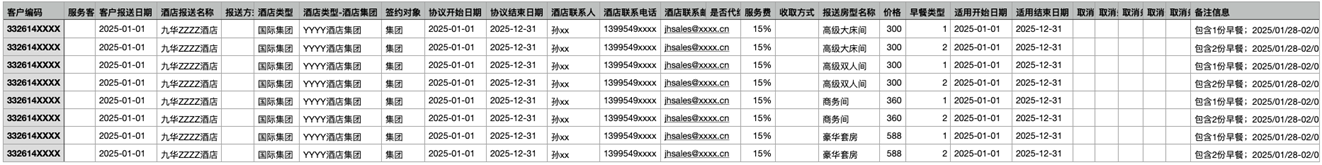 能从合同与报价文本中精准提取目标信息,自动生成格式合规、可直接接入OTA业务系统的CSV文件,核心字段抽取准确率≥95%,减少人工二次整理成本。