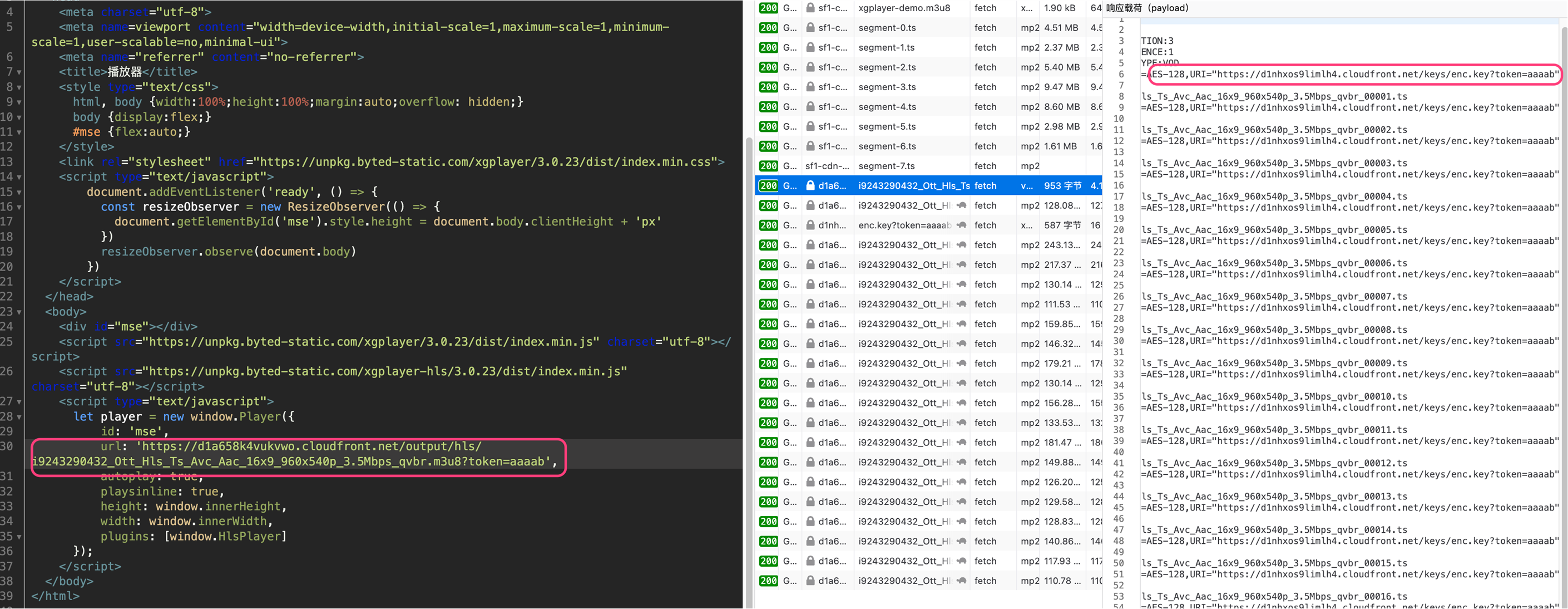 使用 Safari 或者播放器组件打开转码后的 m3u8 文件,可以留意到 token query string 被成功添加到加密密钥 URL。密钥服务通过 token 即可确认当前用户是否有权限访问文件。