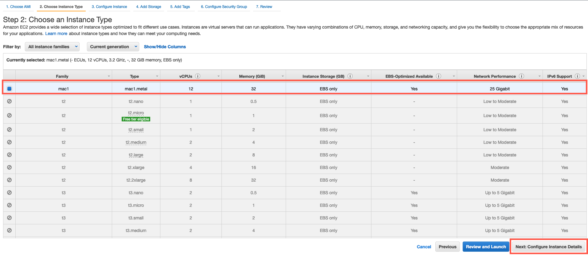 2.3 – 在 Choose Instance Type(选择实例类型)页面上,保留 mac1.metal instance 的默认选择,然后选择 Next: Configure Instance Details(下一步:配置实例详细信息)。