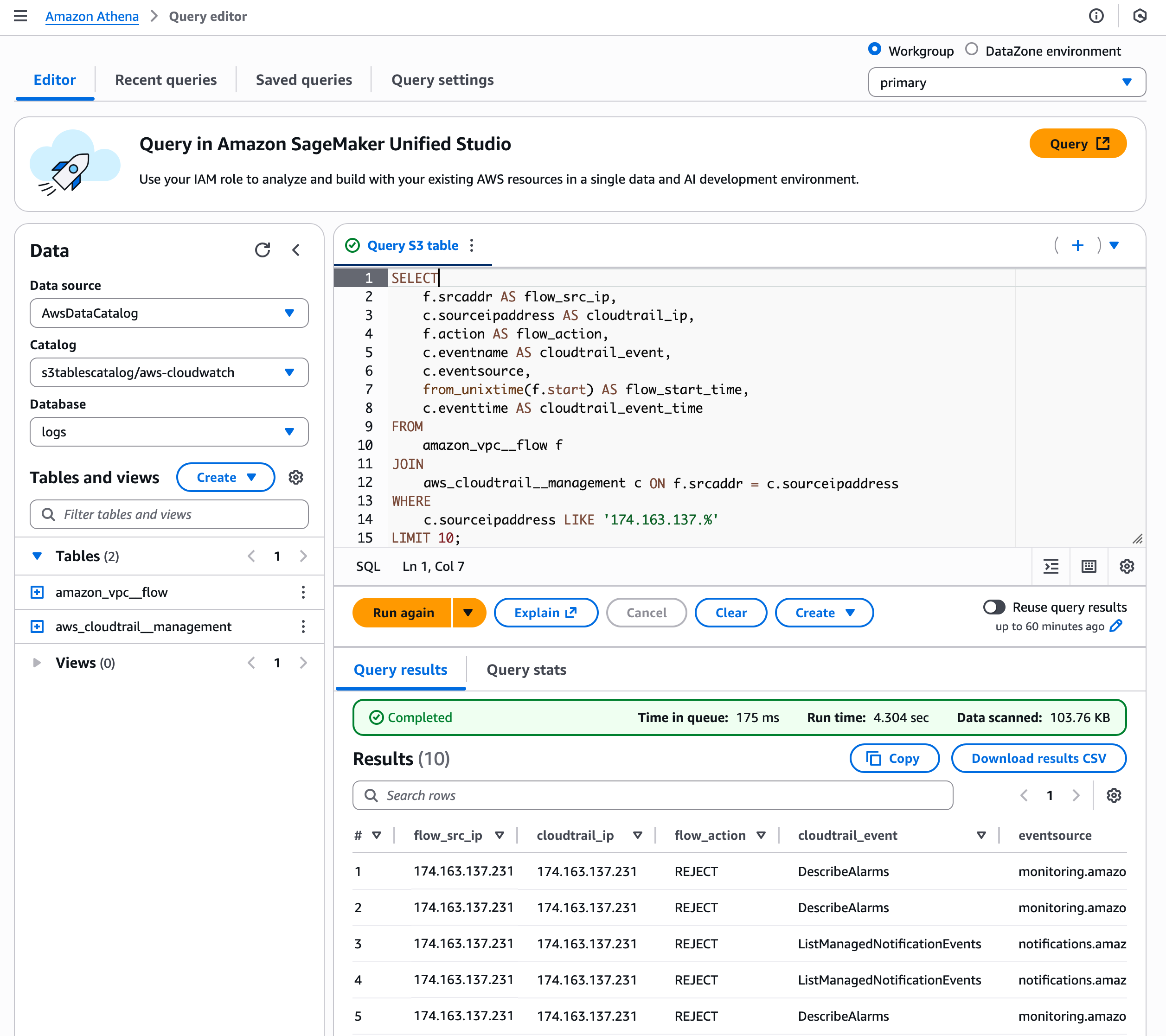 Wie ich bereits erwähnt habe, können Sie Datenquellen in S3 Tables integrieren und gemeinsam abfragen. Zum Beispiel können Sie mit einem Query Editor in Athena Netzwerkverkehr mit AWS-API-Aktivität aus einem bestimmten IP-Bereich (174.163.137.*) korrelieren, indem Sie VPC Flow Logs mit CloudTrail-Logs basierend auf übereinstimmenden Quell-IP-Adressen verbinden.