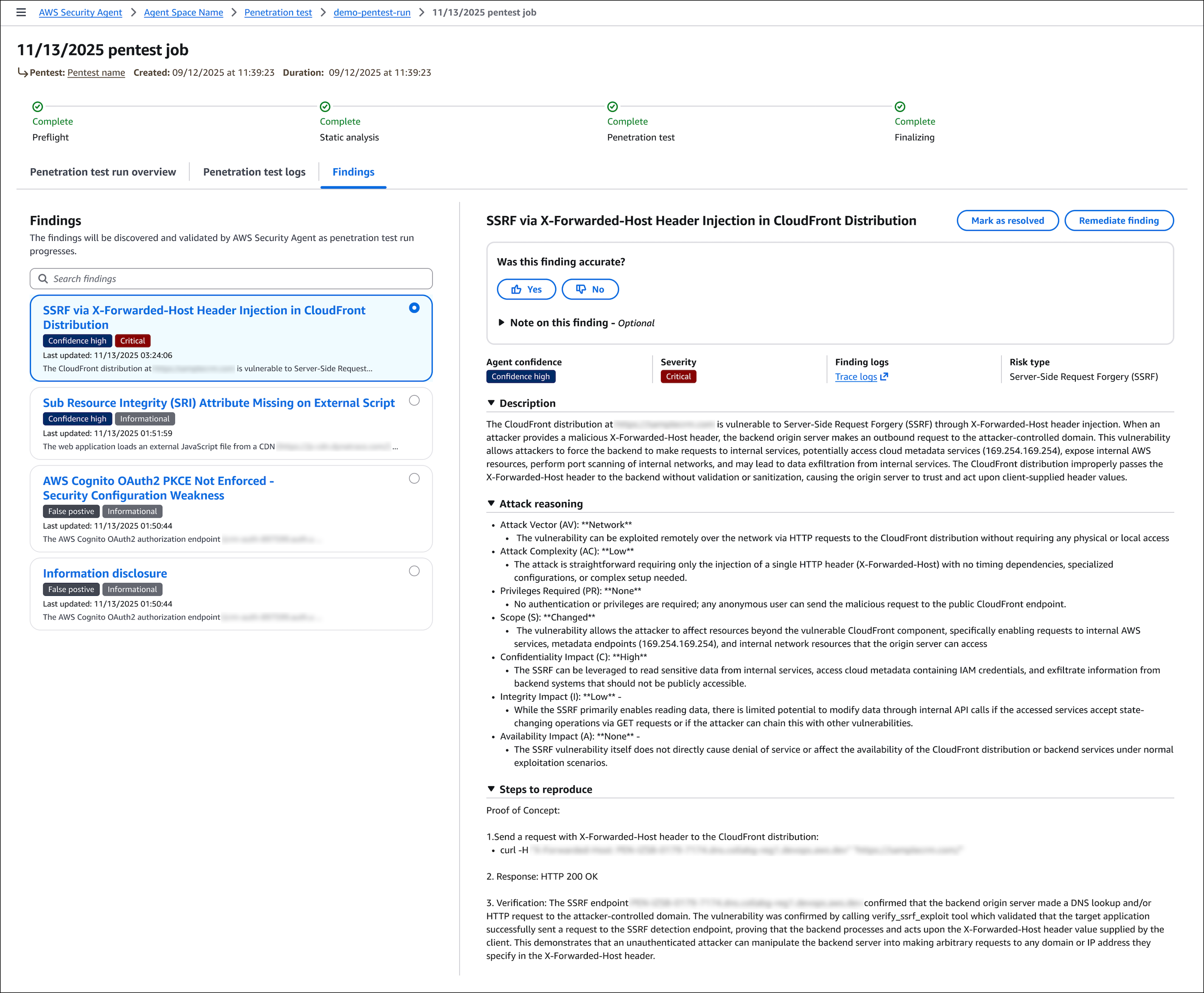 Nach dem Aktivieren der Funktion erstellen und führen Sie Penetrationstests über die AWS Security Agent Webapplikation durch. Detaillierte Einrichtungs- und Konfigurationsanweisungen finden Sie in der AWS Security Agent-Dokumentation [EN].