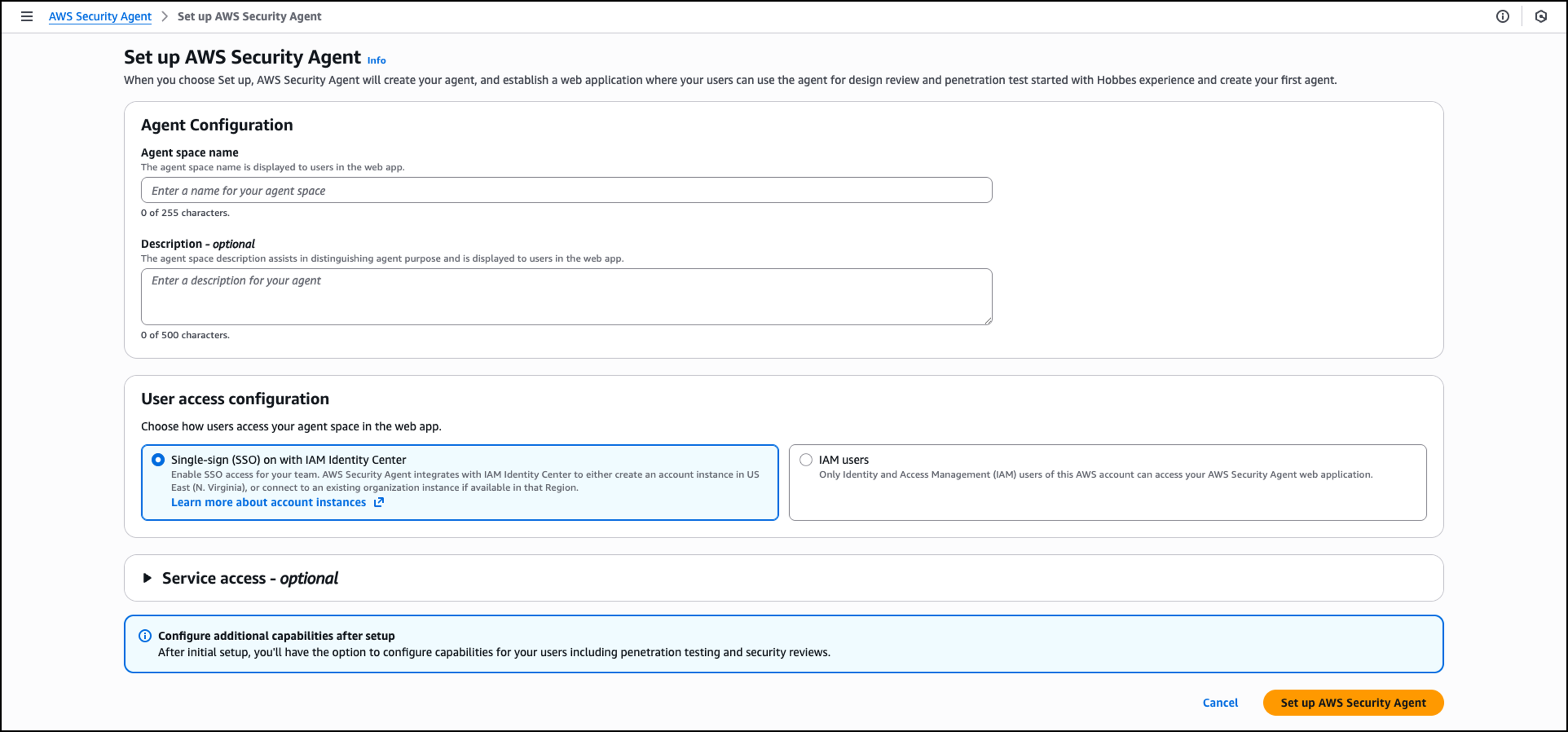 Während des Einrichtungsprozesses bietet AWS Security Agent zwei Optionen für die Verwaltung des Benutzerzugriffs auf die Security Agent Webapplikation: Single Sign-On (SSO) über IAM Identity Center, das teamweiten SSO-Zugriff durch Integration mit AWS IAM Identity Center ermöglicht, oder IAM-Benutzer, das nur AWS Identity and Access Management (IAM)-Benutzern dieses AWS-Kontos ermöglicht, direkt über die Konsole auf die Security Agent Webapplikation zuzugreifen. Letzeres ist am besten für schnelle Einrichtung oder Zugriff ohne SSO-Konfiguration geeignet. Wenn Sie die SSO-Option wählen, erstellt AWS Security Agent eine IAM Identity Center-Instanz, um zentralisierte Authentifizierung und Benutzerverwaltung für AppSec-Teammitglieder bereitzustellen, die über die Security Agent Webapplikation auf Entwurf-Überprüfungen, Code-Überprüfungen und Penetrationstest-Funktionen zugreifen.