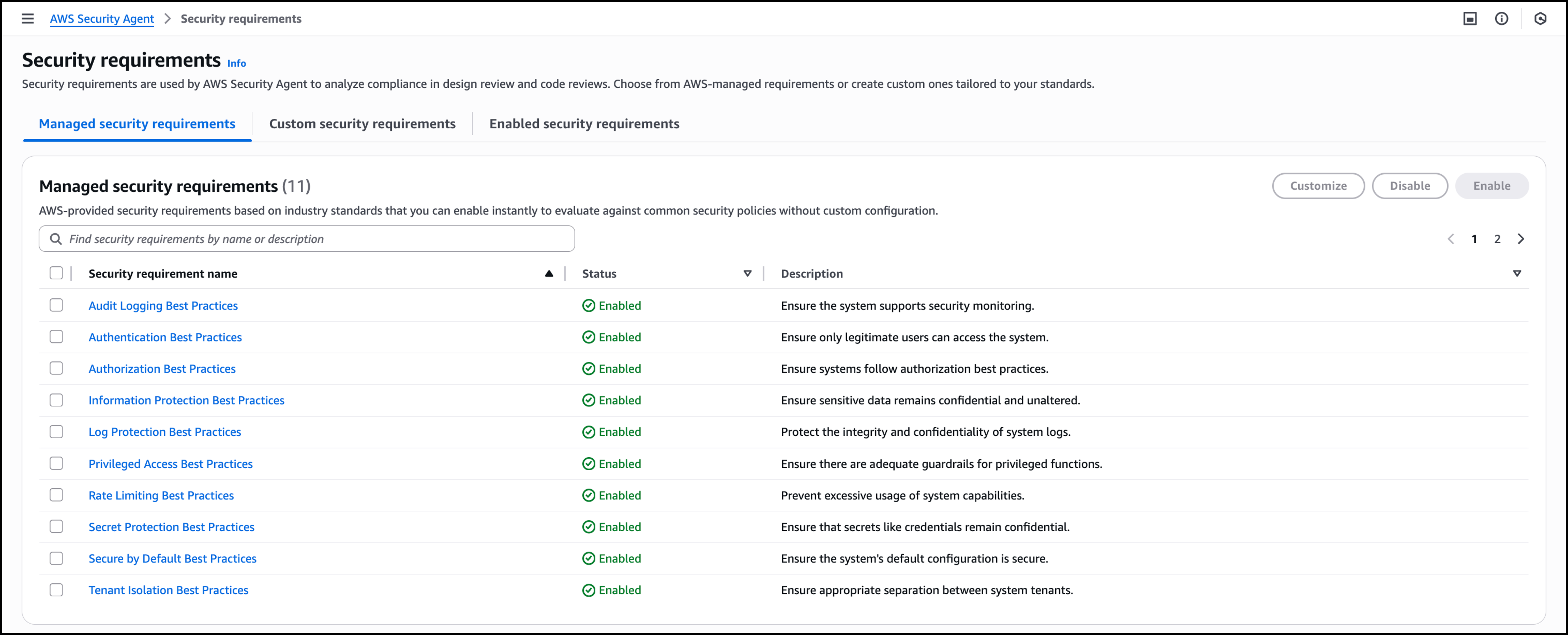 Nach dem Erstellen einer Agentenumgebung zeigt die Agent-Konfigurationsseite drei Funktionskarten an: Entwurfsüberprüfung, Code-Überprüfung und Penetrationstests. Obwohl dies für den Betrieb der Penetrationstests nicht erforderlich ist, können Sie, wenn Sie die Funktionen für Entwurfsüberprüfung oder Code-Überprüfung verwenden möchten, konfigurieren, welche Sicherheitsanforderungen als Grundlage für diese Bewertungen dienen. AWS Security Agent beinhaltet von AWS verwaltete Anforderungen, und Sie können optional benutzerdefinierte Anforderungen definieren, die auf Ihre Organisation zugeschnitten sind. Sie können auch verwalten, welche Teammitglieder Zugriff auf den Agenten haben.