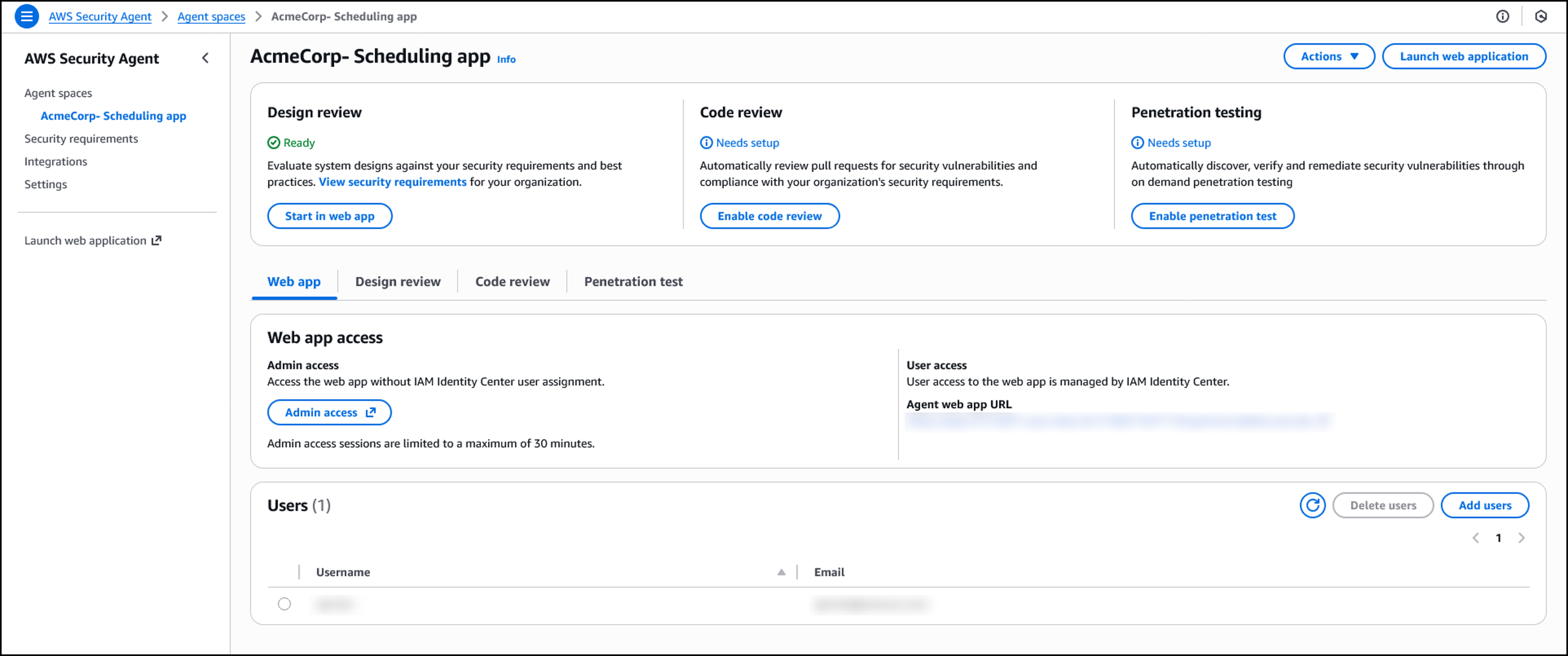 Wenn Sie die erste Agentenumgebung in der AWS Management Console erstellen, erstellt AWS die Security Agent Webapplikation. Die Security Agent Webapplikation ist der Ort, an dem Benutzer Entwurf-Überprüfungen durchführen und Penetrationstests innerhalb der von Administratoren in der Konsole festgelegten Grenzen ausführen. Benutzer wählen aus in welcher Agentenumgebung sie arbeiten möchten, wenn sie Entwurf-Überprüfungen durchführen oder Penetrationstests ausführen.