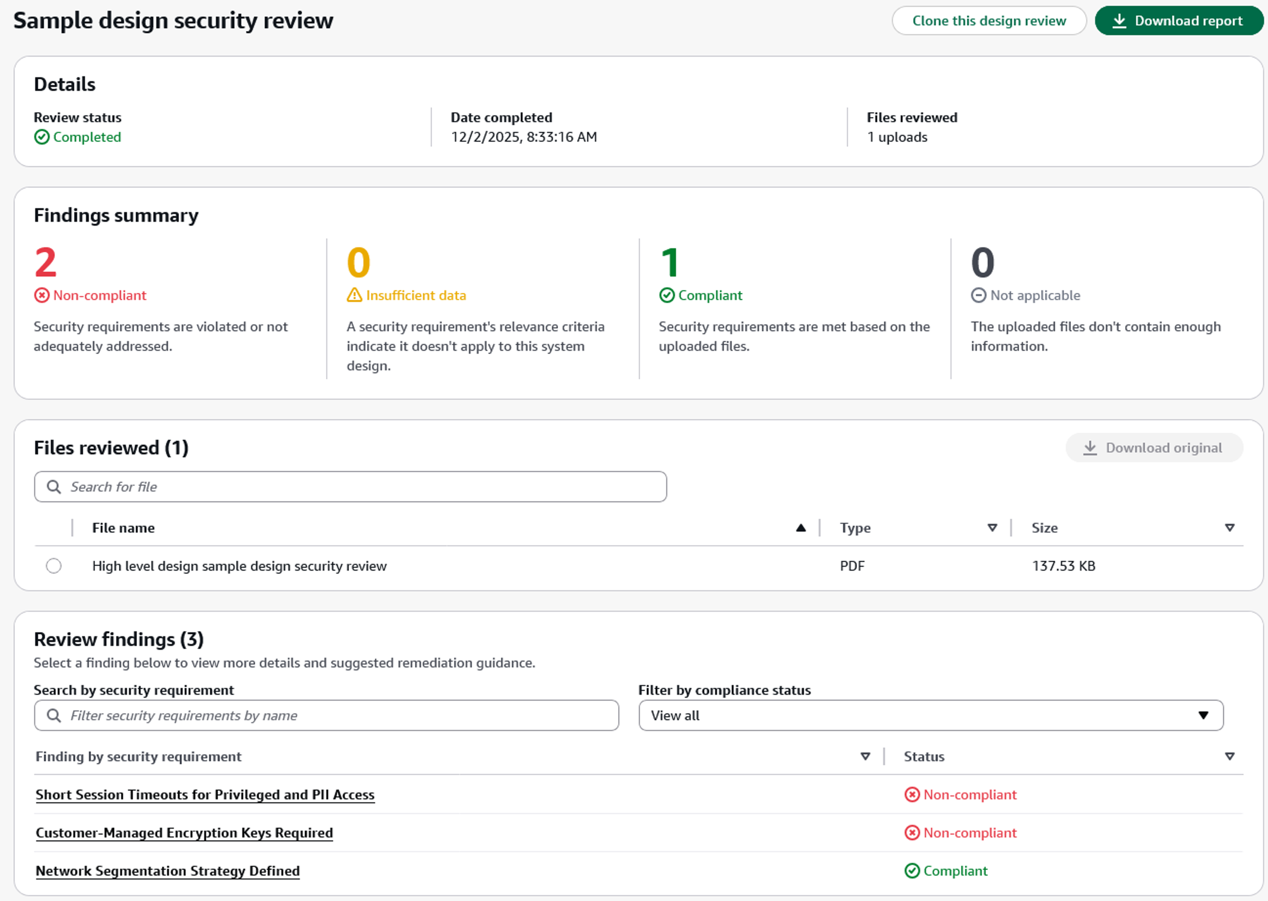 Wenn Sie ein bestimmtes Ergebnis auswählen, zeigt AWS Security Agent eine detaillierte Begründung an, die den Compliance-Status erklärt und empfohlene Behebungsschritte bereitstellt. Diese kontextbewusste Analyse hilft Ihnen, Sicherheitsbedenken zu verstehen, die spezifisch für Ihr Design sind, anstatt generischer Sicherheitsanleitungen. Für Designs mit nicht konformen Ergebnissen können Sie Ihre Dokumentation aktualisieren, um die Sicherheitsanforderungen zu erfüllen, und eine neue Entwurfsüberprüfung erstellen, um die Verbesserungen zu validieren. Sie können auch Clone this design review auswählen zum Klonen der Entwurfsüberprüfung, um eine neue Bewertung basierend auf der aktuellen Konfiguration zu erstellen. Außerdem können Sie zum Herunterladen des Berichts Download report auswählen, um die vollständigen Ergebnisse zum Teilen mit Ihrem Team zu exportieren.