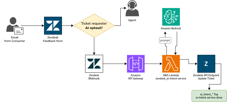 Das Herzstück der technischen Lösung ist eine AWS Lambda-Funktion, die als Brücke zwischen Zendesk und Amazon Bedrock fungiert und diese Intent-Definitionen nutzt. Die folgende Architektur zeigt den kompletten Workflow von der eingehenden Kundenanfrage bis zur automatisierten Bearbeitung:
