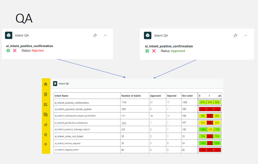 Das QA-Dashboard zeigt die Dimensionen der Automatisierung: Mit über 1.100 Tickets allein für ai_intent_positive_confirmation