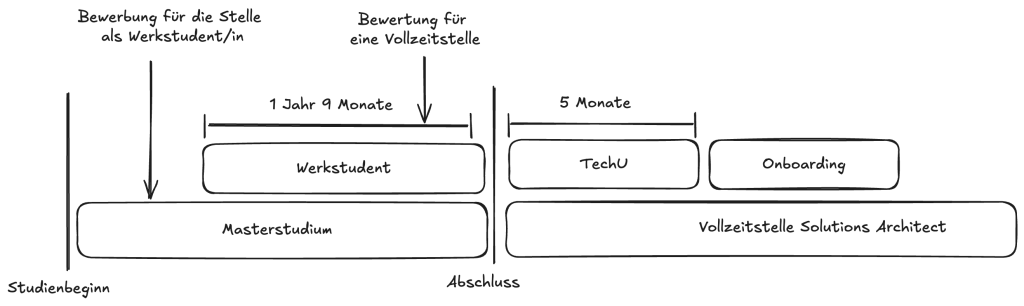 Abbildung 1 skizziert den Verlauf meiner Zeit als Working Student bis hin zum Vollzeit-Solutions Architect – eine Reise, die ich in diesem Blog ausführlich erläutern werde.