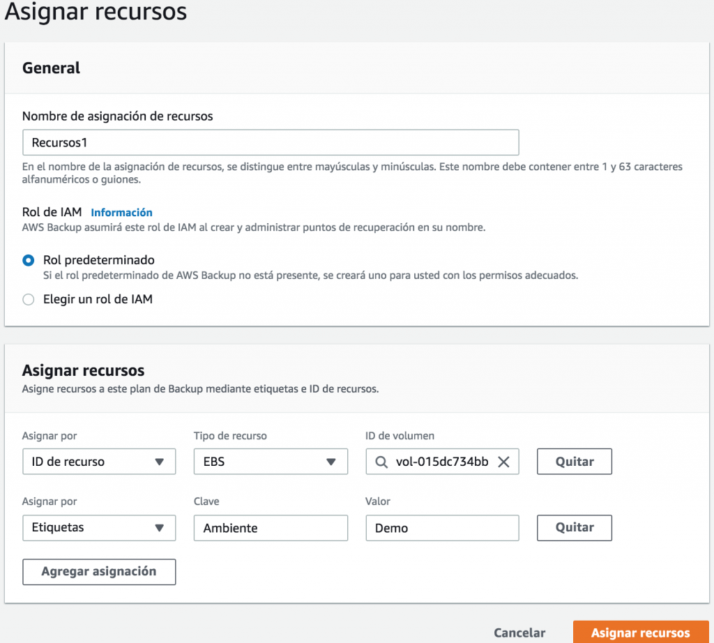 En ella seleccionamos un volúmen EBS conectado a una instancia EC2 (un Windows Server 2019 base) y también elegimos que todo lo que tenga la etiqueta Ambiente:Demo sea respaldado.