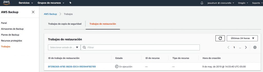 Al dar clic en “Restaurar copia de seguridad”, se creará un ID de trabajo de restauración y podremos ver el estatus en el que se encuentra aquí mismo (Fig 18):