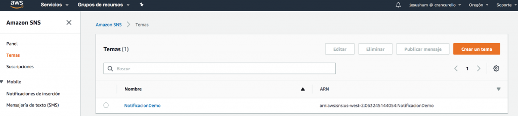 En primer lugar será necesario crear un Tema de mensajes dentro de Amazon SNS (Fig23, Fig24 y Fig25), para después generar una o varias suscripciones a este Tema. Durante el ejemplo, crearemos dos suscripciones. Una vía mensaje de texto SMS y otra vía correo electrónico.