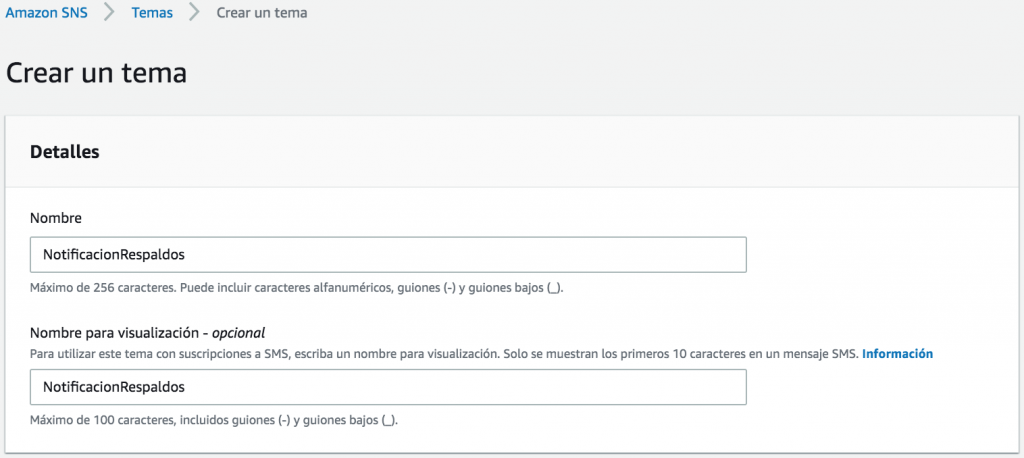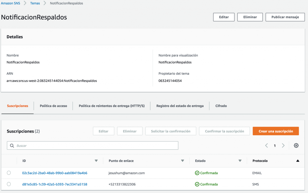 Si usted lo desea, puede recibir notificaciones cada vez que una copia de seguridad sea creada ya sea de forma manual o por medio del servicio de AWS Backup.