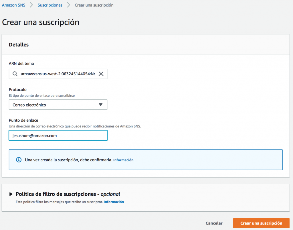 Para hacerlo, es necesario utilizar en conjunto dos servicios de AWS. Amazon Simple Notification Service (Amazon SNS) y la característica de Eventos de Amazon CloudWatch.