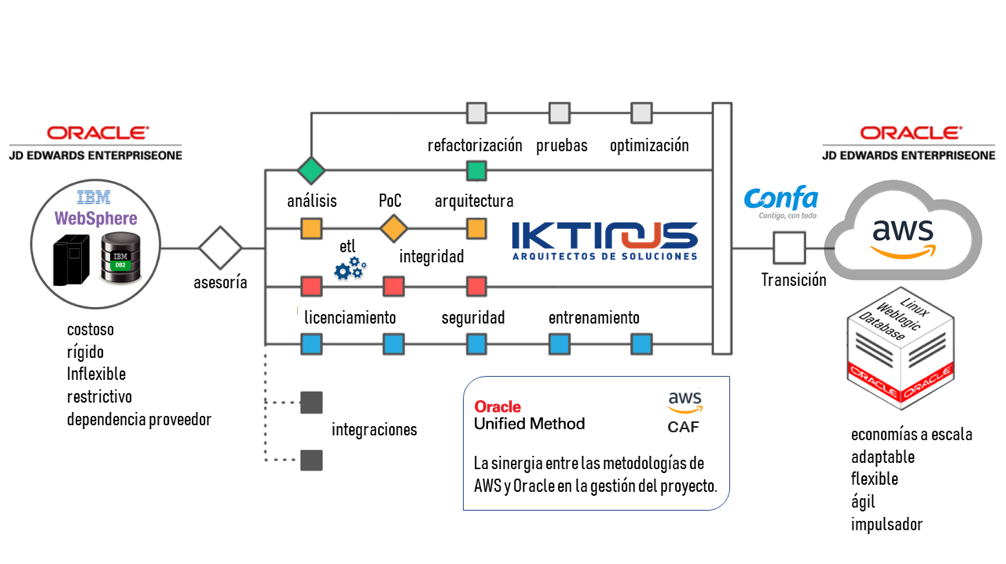 CONFA buscó a Iktinus porque requería reducir el gasto operativo en costos de mantenimiento de TI, así como el gasto capital en renovaciones y adquisiciones en infraestructura local de computo. Estos altos costos estaban limitando la organización a desarrollar, optimizar y transformar sus valiosos servicios a los ciudadanos. Al mismo tiempo, la organización era consciente de la necesidad de modernizar y evolucionar su plataforma monolítica y heredada utilizada para ejecutar su solución ERP de misión crítica para el negocio (Oracle JD Edwards EnterpriseOne).