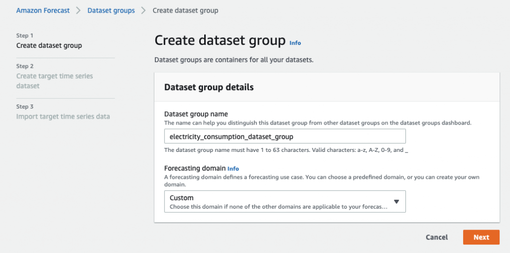 1 – Via Amazon Forecast, créez un premier dataset group. Les dataset groups sont des collections d’un ou plusieurs de vos ensembles de données. Les dataset groups vous permettent d’organiser vos ensembles de données par cas d’utilisation spécifique. Par exemple, une société d’électronique peut créer un groupe de données pour prévoir la demande de ses produits et un autre groupe de données pour prévoir l’utilisation de son stock. Une autre entreprise peut utiliser différents groupes de données pour prévoir les effets des réductions de prix, des promotions commerciales et d’autres campagnes.