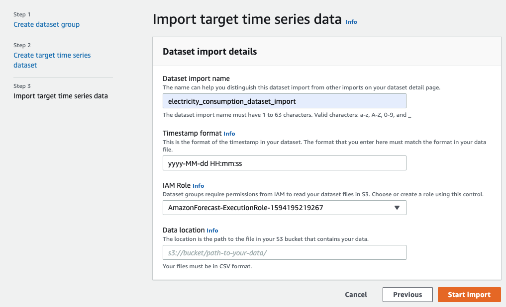 5 – Spécifiez le nom correspondant à l’import du dataset sans oublier le chemin vers votre compartiment/bucket Amazon S3 contenant votre dataset. Ensuite cliquez sur “Start import”.Concernant le rôle IAM autorisant l’accès au compartiment S3 où se situent les données, il est nécessaire ici de créer un nouveau rôle AWS IAM via le formulaire :